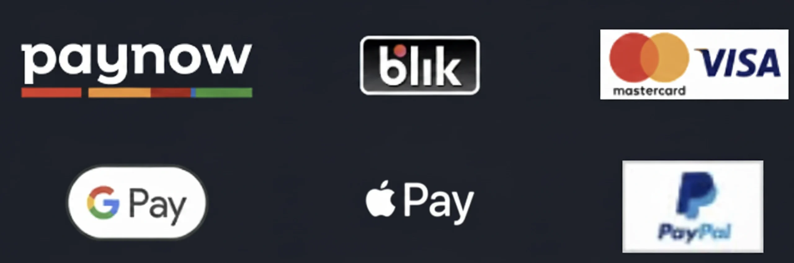 BLIK, Apple Pay, Google Pay , PayPal, Visa, Mastercard, Paynow.